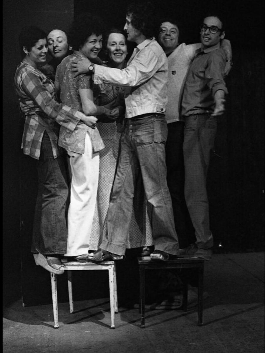 בתמונה ניתן לראות אותה ואת לוין, יחד עם צוות השחקנים והיוצרים בעת העבודה על ההצגה "פופר" בשנת 1976.
